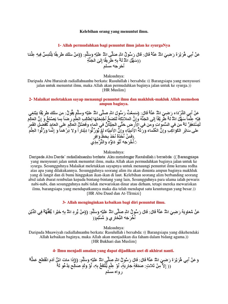 Shukor talib 01 july 2020. Semoga perkongsian ini memberi manfaat buat. Antara kelebihan menuntut ilmu ialah: Hadis yang shahih dalam masalah kewajiban menuntut ilmu adalah hadis dari anas bin malik radliallahu 'anhu bahwa nabi shallallahu 'alaihi wa sallam bersabda, طَلَبُ الْعِلْمِ فَرِيضَةٌ عَلَى كُلِّ مُسْلِمٍ. Hadist menuntut ilmu ilmu merupakan kunci untuk menyelesaikan segala persoalan, baik persoalan yang berhubungan dengan kehidupan beragama maupun persoalan yang berhubungan dengan kehidupan duniawi. Di dalam hadis yang telah disebutkan tadi sesudah penafsiran ayat ini disebutkan, bahwa khidhir berkata.sesungguhnya aku telah menerima ilmu dari allah yang dia ajarkan langsung kepadaku; Hadis sains, hadis tematik, pemberdayaan perempuan. Hifzu pengajian hadis tingkatan 4. Hadits mengenai keutamaan menuntut ilmu. Menuntut ilmu atau belajar adalah kewajiban setiap orang islam. Hadis kelebihan menuntut ilmu nusagates. Menuntut ilmu wajib bagi setiap muslim. (hr. Pqs t 4 by smk lembah bidong issuu.